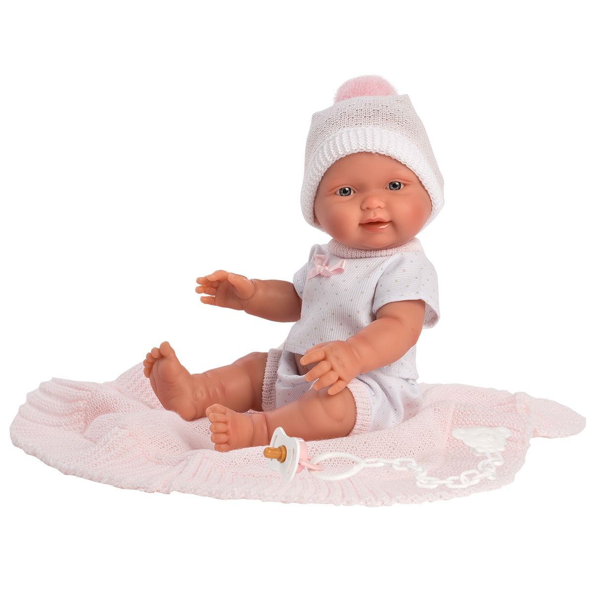 Lalka bobas 26 cm została wyprodukowana przez hiszpańską markę Llorens. Jest to zabawka wykonana z myślą o dzieciach. Jej urocze fałdki na brzuszku oraz delikatny uśmiech wzbudzają potrzebę opieki nad uroczą dziewczynką. Strój lalki składa się z białego sweterka, czapeczki z pomponem oraz spodenek. Do zestawu dołączono dekoracyjny smoczek, który nadaje jej rozkosznego charakteru oraz różowy kocyk. Całe ciałko lalki zostało wykonane z przyjemnego w dotyku winylu, dzięki czemu można kąpać lalkę zanurzając ją w wodzie do poziomu szyi. Lalka została zapakowana w ozdobny karton. Kochamy hiszpańskie lalki Llorens!