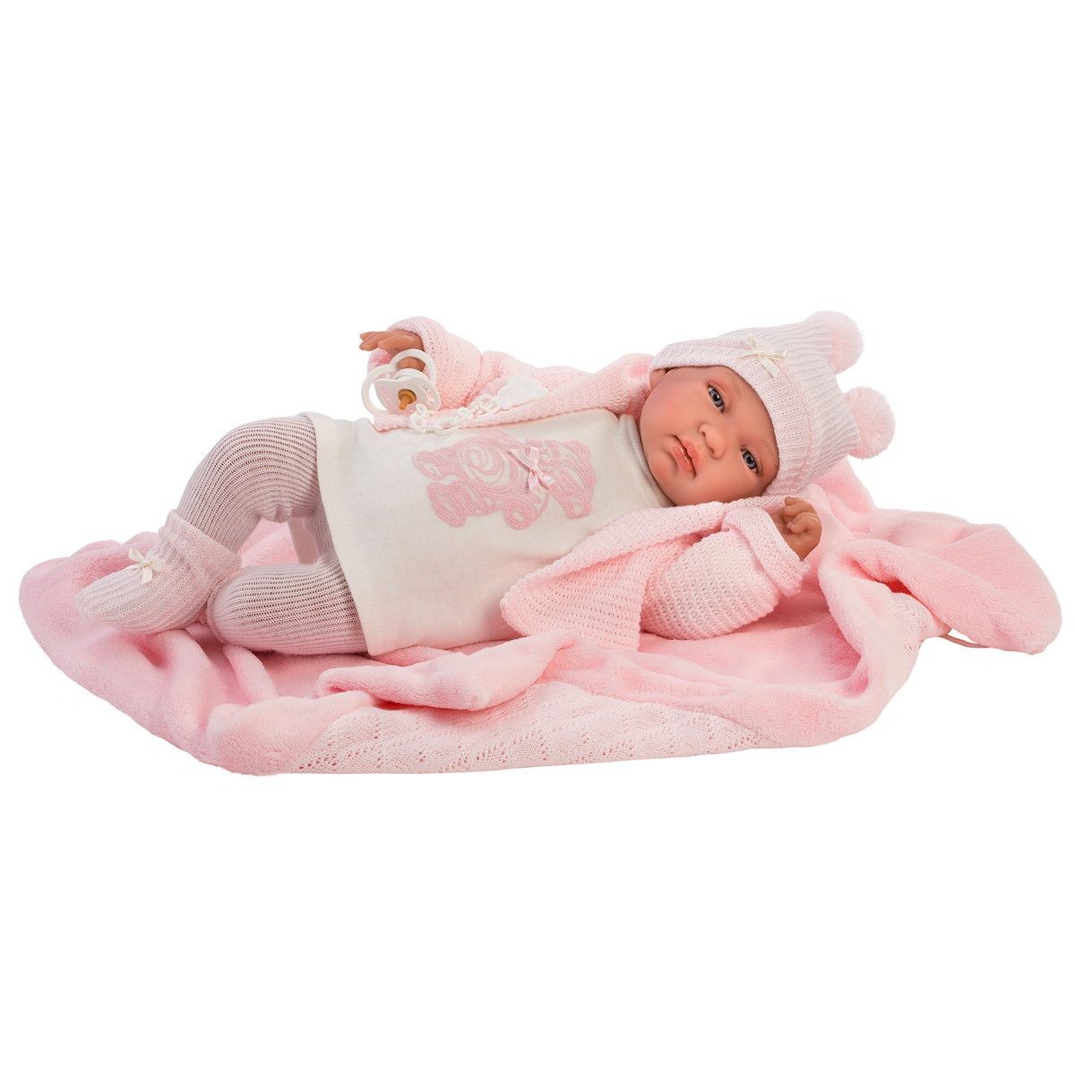 Lalka bobas Tina 43 cm została wyprodukowana w Hiszpanii przez znaną markę Llorens. Dziewczynka jest niezwykle podobna do prawdziwego dziecka dzięki jej uroczym fałdkom, długim rzęsom i malutkim ustkom. Lalka została ubrana w białą tunikę z nadrukiem misia, różowe skarpetki i czapkę z uszkami. Jej materiałowy brzuszek został wypełniony miękką wyściółką. W zestawie znajduję się również różowy kocyk, w który możemy owinąć lalkę. Lalka została zapakowana w ozdobny karton. Załączony smoczek pełni funkcję dekoracyjną. Kochamy hiszpańskie lalki Llorens!