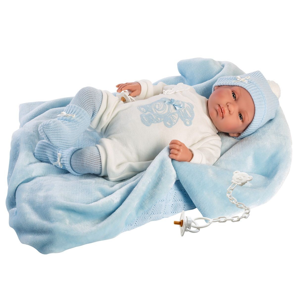 Lalka bobas Tino 43 cm została wyprodukowana przez hiszpańska markę Llorens. Chłopiec Tino posiada urocze fałdki na rączkach i nóżkach, długie rzęsy zdobiące jego niebieskie oczka oraz malutki nosek i ustka. Wszystkie te elementy sprawiają, że Tino wygląda jak prawdziwe dziecko w wieku niemowlęcym. Jego materiałowy brzuszek został wypełniony miękką wyściółką. Lalka bobas została ubrana w białe body z nadrukiem misia, błękitną czapeczkę i skarpetki. W zestawie znajduje się również błękitny kocyk, który możemy owinąć lalkę. Lalka została zapakowana w ozdobny karton. Załączony smoczek pełni funkcję dekoracyjną. Kochamy hiszpańskie lalki Llorens!