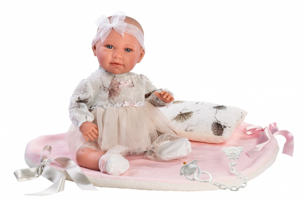 Lalka bobas Mimi została wyprodukowana przez hiszpańską markę Llorens. Jest to zabawka dla dzieci w każdym wieku. Lalka dzięki naturalnemu uśmiechowi, okrągłym policzkom i uroczym fałdkom na rączkach wygląda jak prawdziwe dziecko w wieku niemowlęcym. Ubrano ją w piękną sukienkę baletnicy oraz cudowną opaskę z kokardą. Jej materiałowy brzuszek wypełniono przyjemną w dotyku wyściółką. Po naciśnięciu na brzuszek lalka zapłacze i powie mama, papa, jak prawdziwe dziecko. W zestawie znajduje się również różowy kocyk w kształcie serca ozdobiony atłasowymi kokardami. Lalka swoimi dopracowanymi szczegółami oraz piękną stylizacją zachwyci nie tylko dzieci ale też dorosłych. Lalka została zapakowana w ozdobny karton. Kochamy hiszpańskie lalki Llorens!