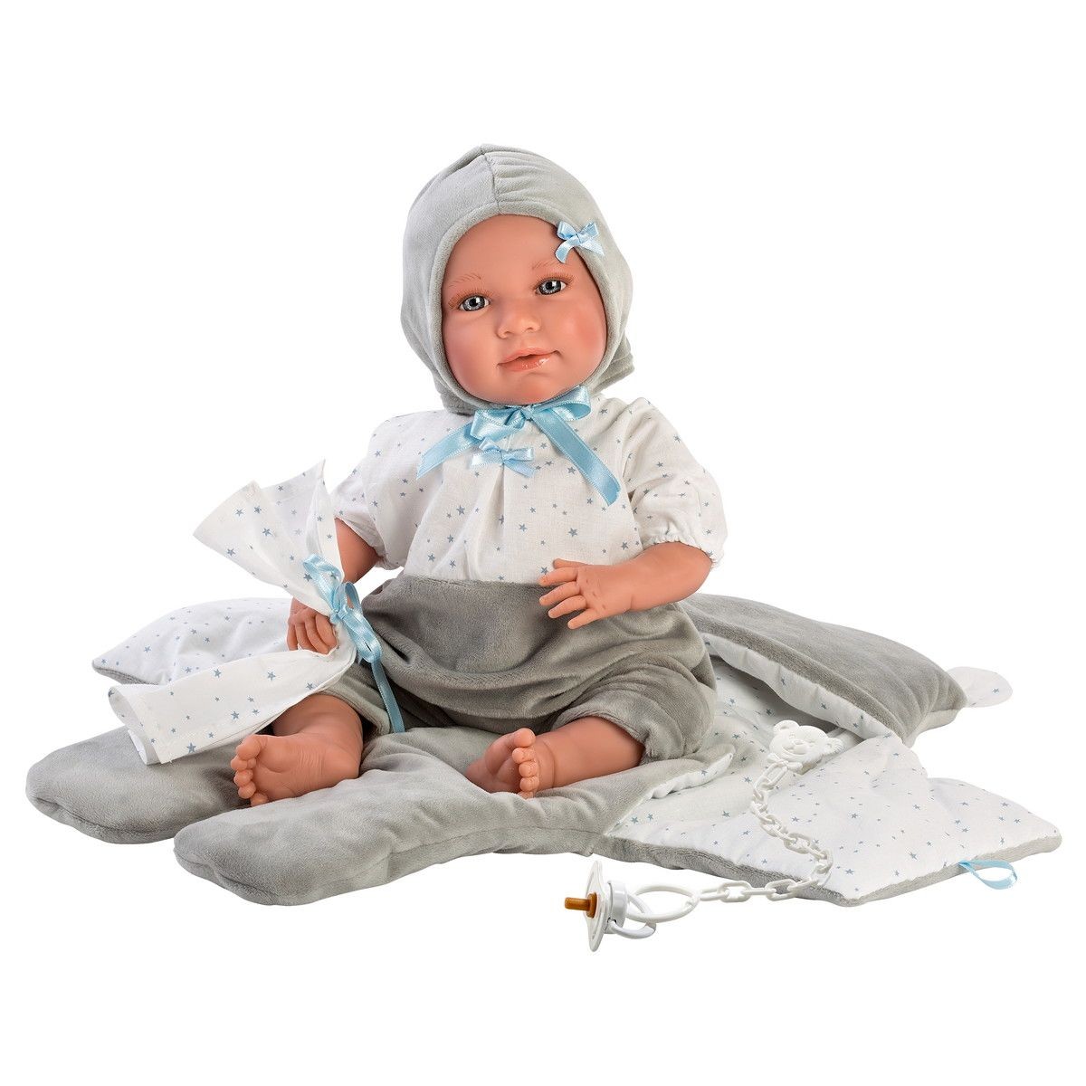 Lalka płacząca Mimo 42 cm została wyprodukowana przez hiszpańską markę Llorens. Lalka swoim wyglądem przypomina prawdziwe dziecko w wieku niemowlęcym. Lalka posiada ruchome, winylowe rączki, nóżki i główkę. Brzuszek lalki został wykonany z materiału i wypełniony miękką wyściółką. Po naciśnięciu na brzuszek lalka zapłacze i powie mama, papa, jak prawdziwe dziecko. Częścią zestawu jest mięciutki szary kombinezon dla lalki z kapturem z uszkami misia, bawełniana pieluszka oraz ozdobny smoczek. Kochamy hiszpańskie lalki Llorens!