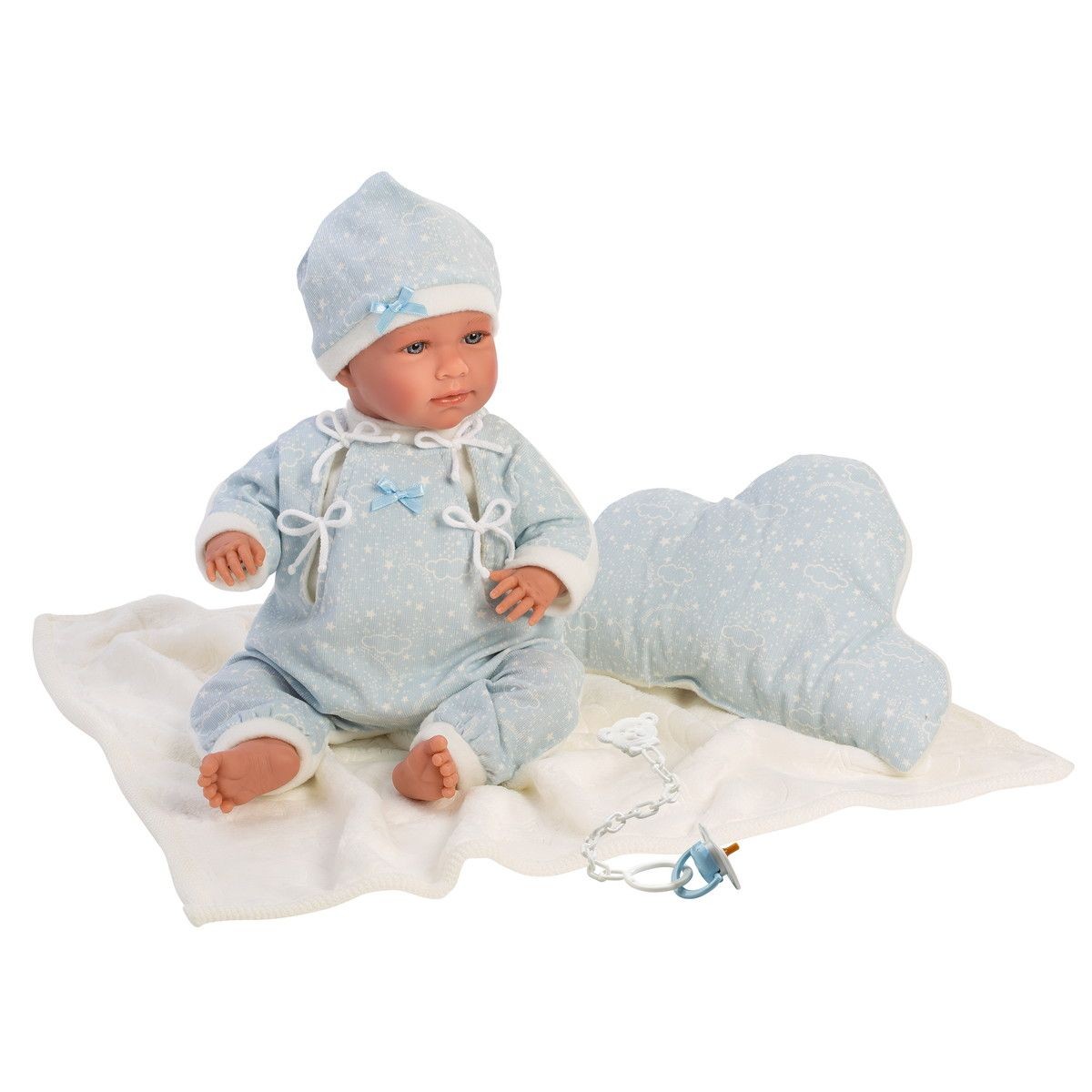 Lalka płacząca Mimo 42 cm została wyprodukowana przez hiszpańska markę Llorens. Jest to uroczy chłopiec o niezwykłym podobieństwie do prawdziwego dziecka w wieku niemowlęcym. Mimo bardzo lubi swój smoczek więc gdy mu go zabierzemy będzie płakał i wołał mama, papa. Ciało lalki zostało wykonane z przyjemnego w dotyku winylu a brzuszek z materiału, wypełniony miękką wyściółką. Chłopiec został ubrany w błękitny pajacyk i czapeczkę. Do zestawu dołączono biały kocyk oraz pasującą do stylizacji lalki poduszkę-chmurkę. Lalka została zapakowana w ozdobny karton. Załączony smoczek pełni funkcję dekoracyjną. Kochamy hiszpańskie lalki Llorens!