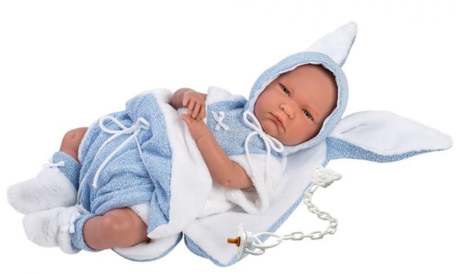 Lalka bobas chłopiec płaczący Lalo 42 cm został wyprodukowany przez hiszpańską markę Llorens. Jest to zabawka dla dzieci w każdym wieku. Jego realistyczny wygląd wynika ze starannego dopracowania szczegółów przy ręcznej produkcji. Jego ulubiony smoczek został dołączony do zestawu i pełni funkcję dekoracyjną. Gdy naciśniemy lalkę na brzuszek, Lalo będzie płakał i wołał mama, papa jak prawdziwe dziecko. Chłopiec posiada kocyk z fantastycznymi uszami królika. Można nim owinąć lalkę i przewiązać ją sznureczkiem. Lalka została zapakowana w piękny prezentowy karton. Kochamy hiszpańskie lalki Llorens!