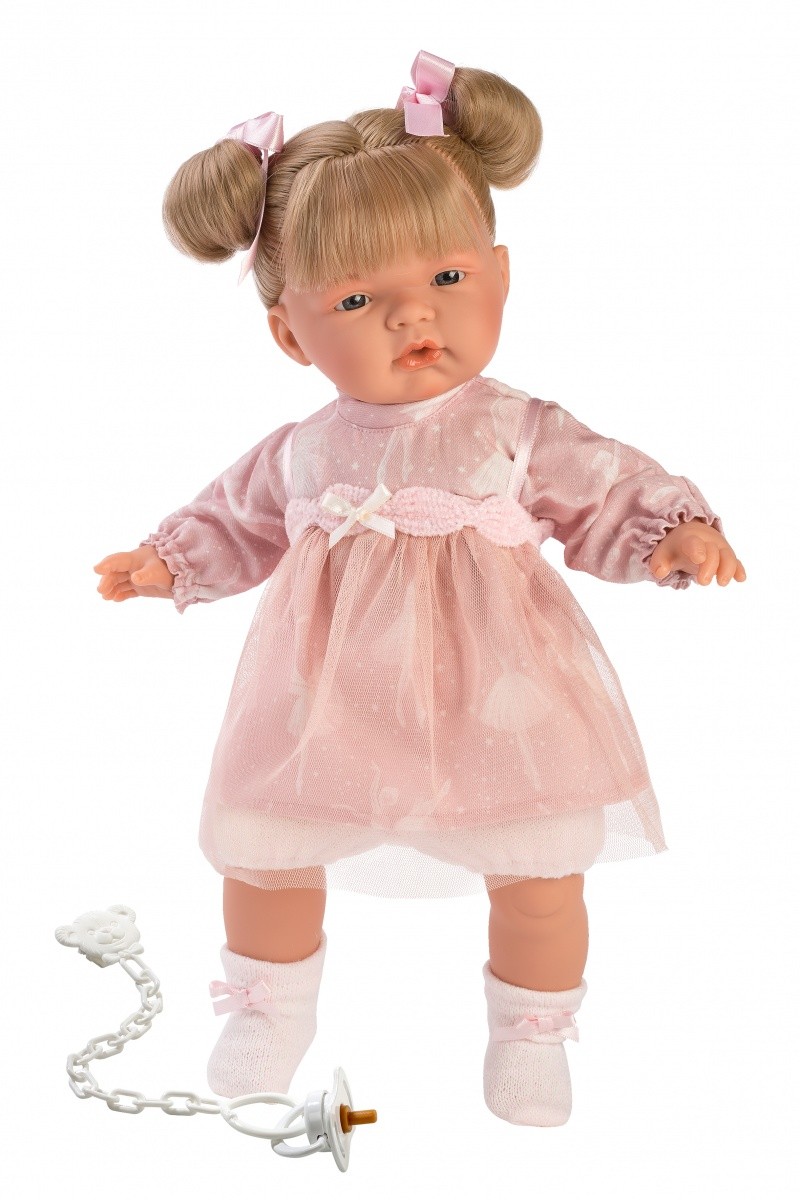 Lalka płacząca Joelle 38 cm to zabawka dla dzieci wyprodukowana przez hiszpańską markę Llorens. Dla Joelle została przygotowana piękna, różowa stylizacja baletnicy. Do wykonania ubranek użyto tkanin najwyższej jakości aby zapewnić dziecku wysoki komfort zabawy. Jej materiałowy brzuszek został wypełniony miękką wyściółką. Joelle jak każde dziecko bardzo lubi swój smoczek, więc gdy go jej zabierzemy będzie płakać i wołać mama, papa. Lalka została zapakowana w ozdobny karton. Kochamy hiszpańskie lalki Llorens!