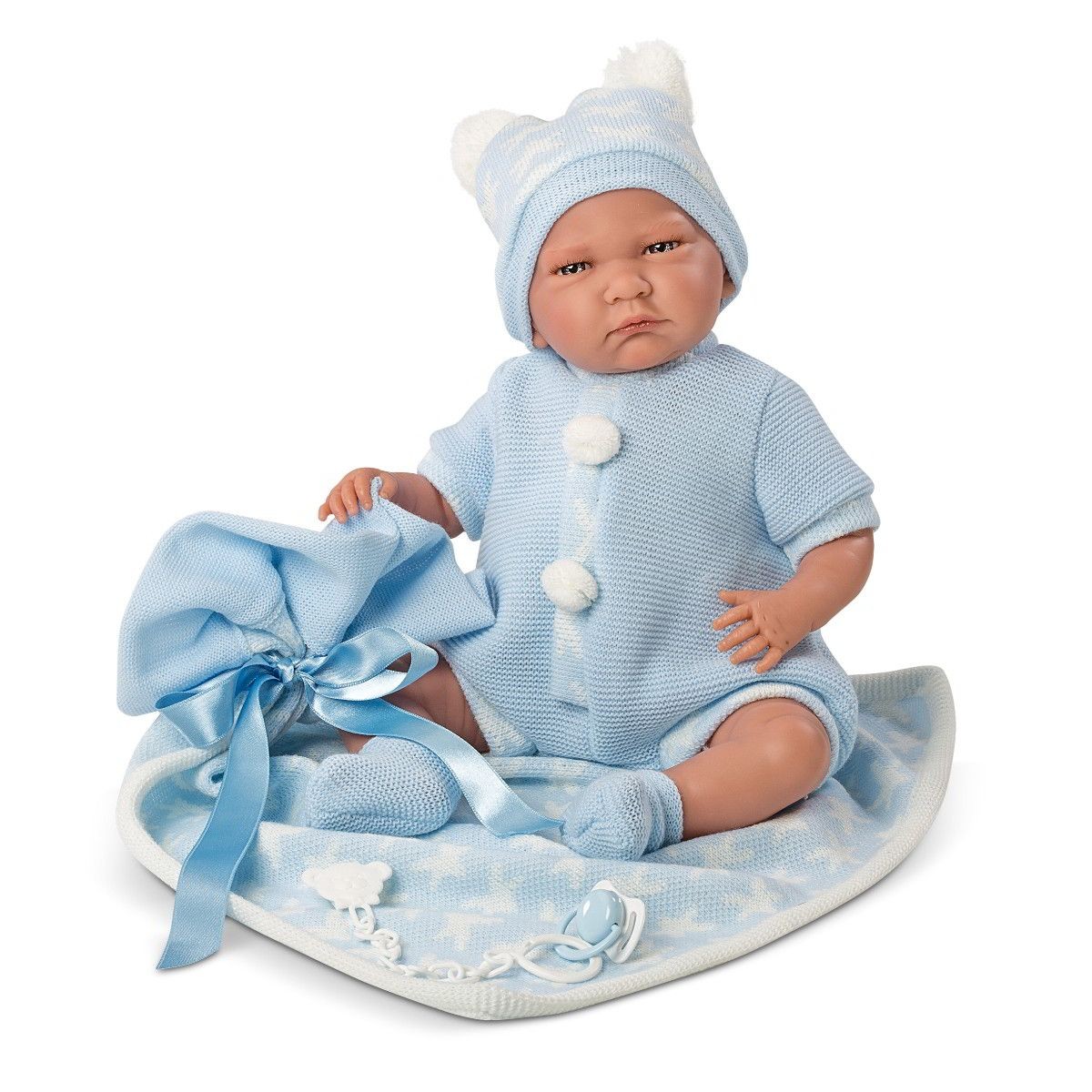 Główkę naszej lali zdobią piękne, błękitne oczy z długimi, czarnymi rzęsami oraz niebieska czapeczka w białe gwiazdki z pomponami. Lalo ubrany jest w niebieski kostium z guziczkami i skarpetki.