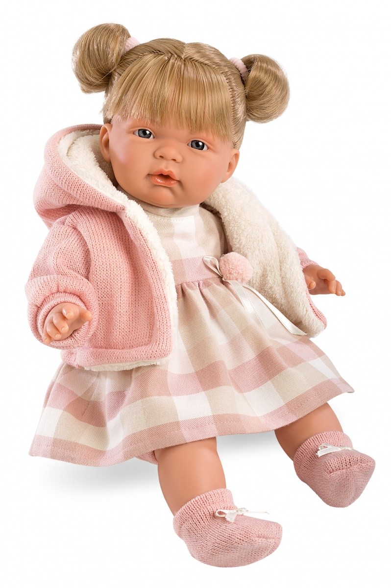 Jej ciało zrobione jest z przyjemnego w dotyku winylu a brzuszek wypełniony miękką wyściółką. Po wyjęciu smoczka lalka zapłacze i zawoła: mama, papa! Główkę naszej lali zdobią dwa kucyki. Lucia ubrana jest w różową sukienkę w kratę pod którą znajdują się szorty, różową bluzę z futerkiem oraz skarpetki pasujące do kompletu. Lalka zapakowana jest w kartonowe pudełko, idealne na prezent.