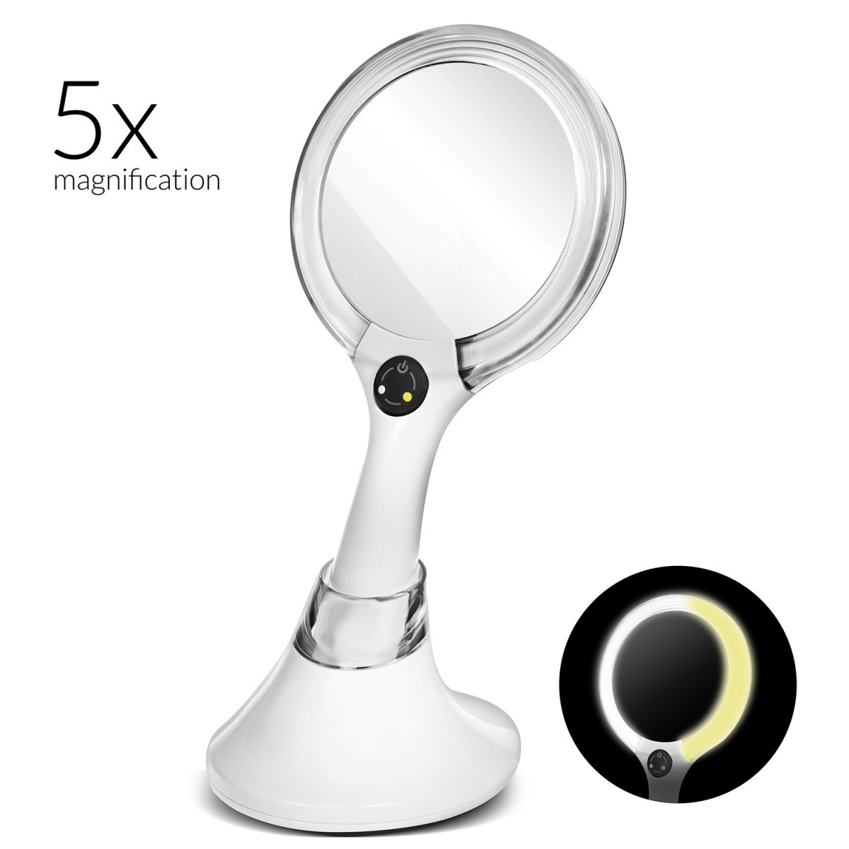 Kosmetyczne lusterko z praktycznym podświetleniem LED. Z jednej strony lusterko posiada pięciokrotne powiększenie, które pozwala na dokładne i precyzyjne wykonanie makijażu. Jasne podświetlenie LED zapewnia doskonałe podświetlenie całej twarzy. Wygodny przycisk umieszczony pod lusterkiem pozwala na przełączanie między światłem naturalnym i ciepłym białym. Idealnie nadaje się do gabinetów kosmetycznych, jak i do użytku domowego. Z naszym lusterkiem nie ma potrzeby wymieniać baterii! Lusterko posiada wbudowany akumulator litowo-jonowy, który ładuje się po umieszczeniu lusterka na podstawce zasilanej załączonym kablem micro USB.