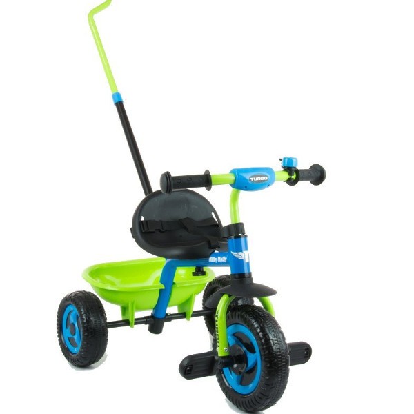 Rowerek Turbo posiada metalową, stabilną ramę. Wygodne siedzisko z pasmi bezpieczeństwa, które można regulować w czterech pozycjach oraz pasy bezpieczeństwa. Produkt jest wyposażony w funkcję wolnego kola, odczepiany uchwyt dla rodzica, a także koszyk na zabawki. Rowerek przeznaczony jest dla dzieci w wieku od 15 do 36 miesiąca życia.