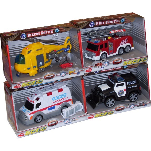 Małe pojazdy Action Series bez napędu, ze światłem i dźwiękiem, z ruchomymi elementami, do wyboru wóz policyjny, ambulans, helikopter i wóz strażacki, baterie: 1,5V R14/R41 (baterie w zestawie), 15-18 cm.