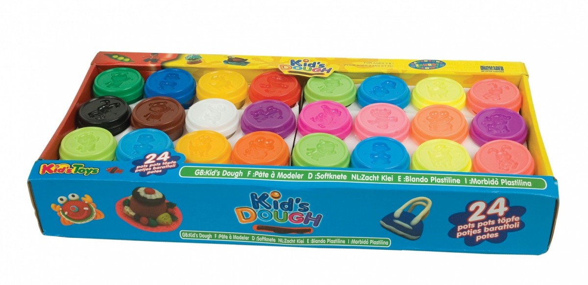 24 kompaktowe opakowania z podstawowymi kolorami, masa plastycznej która śiwetnie dadaje się do rozwoju zdolności manulanych dzięki specilanycm własciwosciom nie przywleka do dłoni podczas zabawy.