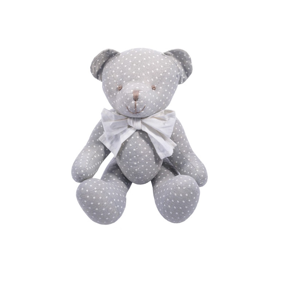 - Miś o imieniu Edgar uszyty z szarego materiału w białe grochy o rozmiarze 38cm.