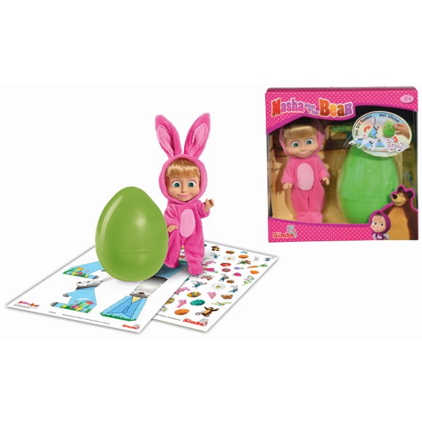 Masza w stroju króliczka w zestawie z naklejkami do udekorowania jajka oraz arkuszem do samodzielnego złożenia wielkanocnego królika.