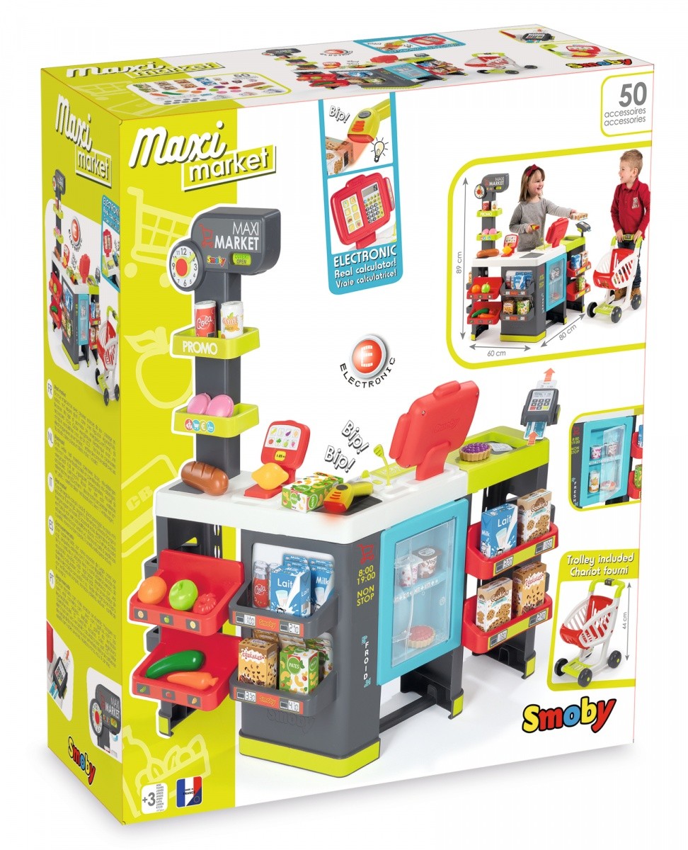 Duży zestaw z elektroniczną kasą, zintegrowanym kalkulatorem z ekranem LCD, skanerem z dźwiękiem i światłem, wagą mechaniczną, czytnikiem kart kredytowych, drukarka do paragonów, wózkiem na zakupy, lodówką.