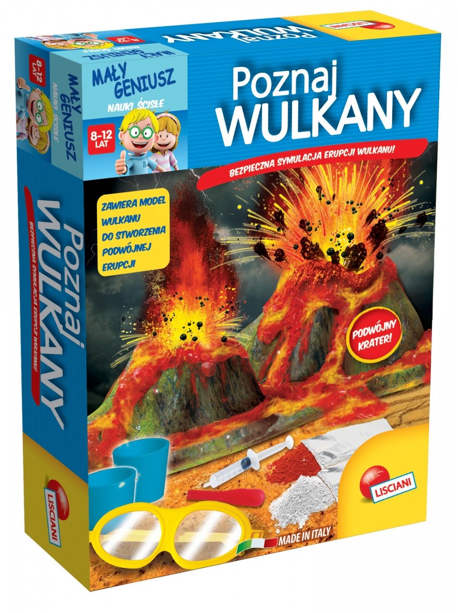 Opakowanie zawiera niezwykły model z dwoma kraterami do przeprowadzenia dwóch, bezpiecznych erupcji oraz ilustrowaną instrukcję zawierającą wiele, naukowych ciekawostek.