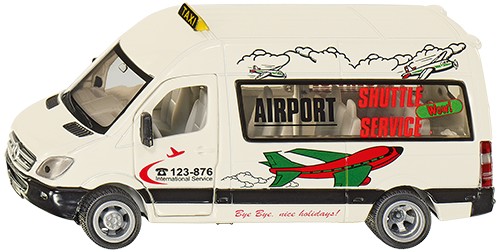 Znak „taxi” na dachu oraz atrakcyjny napis „transfer z lotniska” ukazują funkcjonalną stronę tego pojazdu, sugerując dzieciom temat do zabawy. Możliwość otwarcia drzwi kierowcy, pasażera oraz tylnych drzwi.