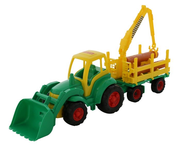 "Mali chłopcy uwielbiają duże maszyny, które widzą na ulicach, polach, placach budowy. Chętnie sięgają z półek sklepowych po ich miniatury. Dla dzieci ważne, by wyglądały jak prawdziwe. Dla rodziców by były trwałe i bezpieczne. Takie właśnie są pojazdy z serii MISTRZ od firmy Polesie. Wykonane z wysokiej jakości plastiku przez długi czas będą przynosić radość z zabawy naszym pociechom.Traktor z łyżką + przyczepa do przewozu dłużyc MISTRZ to klasyczny pojazd na czterech szerokich, dużych kołach. Ich struktura jest nierówna, by mógł pokonywać różne rodzaje podłoża. Kabina traktorzysty jest przestronna. Z pewnością zmieści się w niej figurka ulubionego bohatera. Na przedniej części traktora umieszczono łyżkę. Ona sama jak i ramię, na którym się znajduje są ruchome. Do traktora dołączono przyczepę, na której jest miejsce do przewozu drewnianych kłód (dołączonych do zestawu). Jest również obrotowy, rozkładany chwytak na długim ramieniu umożliwiający transportowanie dłużyc z i na pojazd."