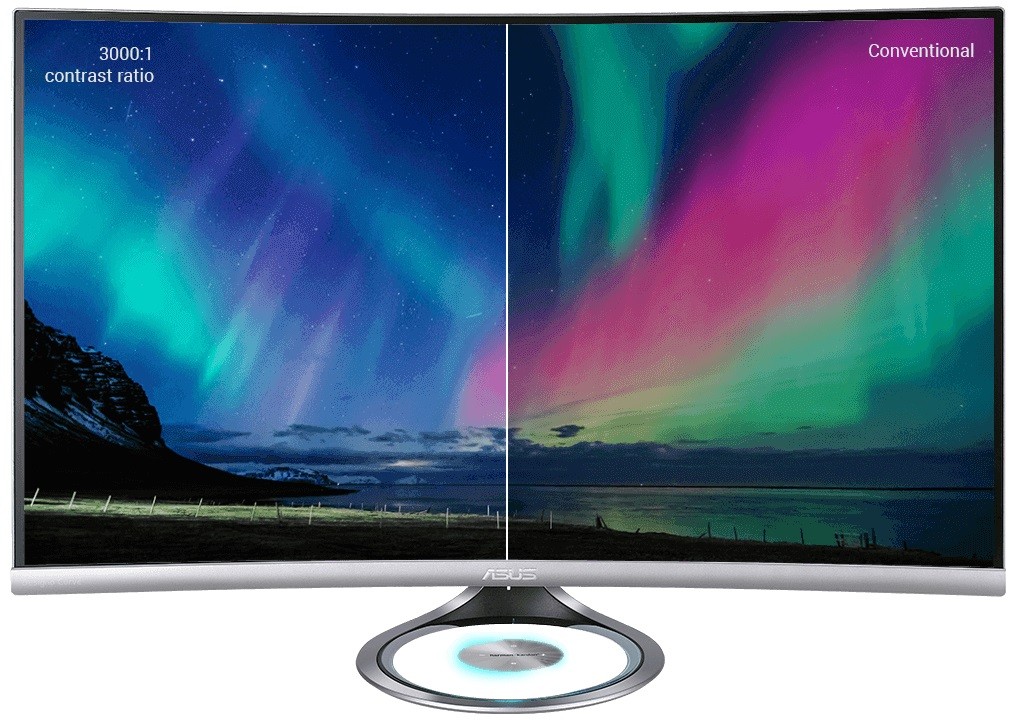 Zakrzywiony monitor ASUS Designo Curve MX32VQ 32 cale, WQHD, zakrzywienie 1800R, bezramkowy, podstawka Halo Lighting, Audio opracowane przez Harman Kardon, technologie Flicker Free, Blue Light Filter.
