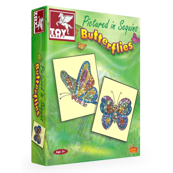 Używając mieniących cekinów możesz stworzyć barwne obrazki. Do zestawu dołączone są arkusze przedstawiające różne gatunki motyli. Motyle przedstawione są w locie.