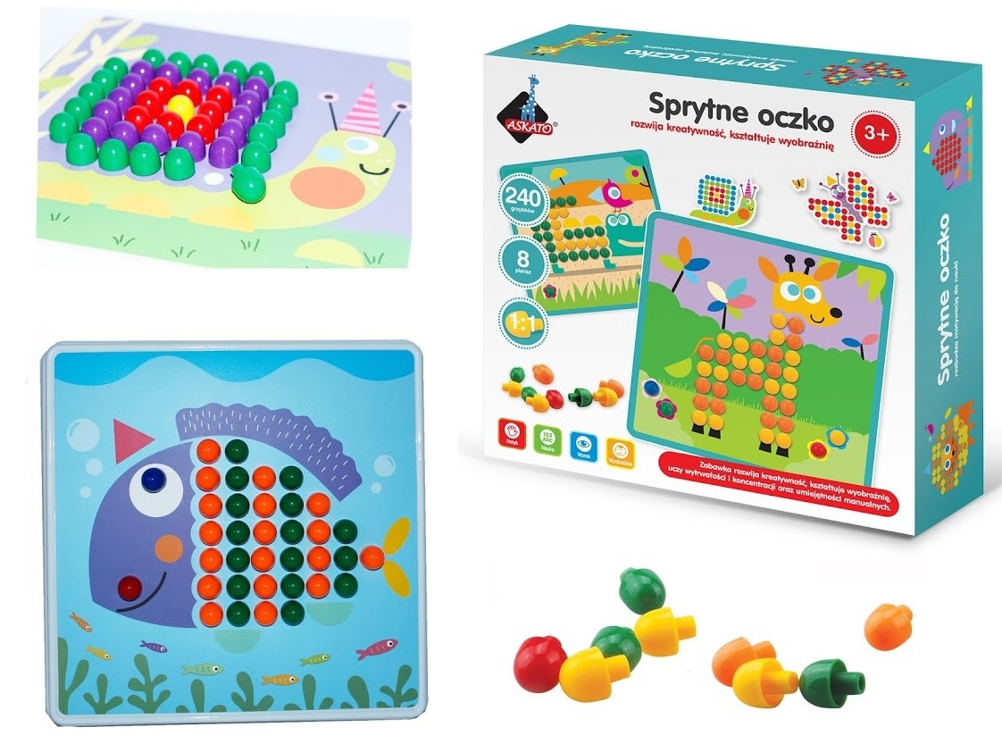 Strona główna Zabawy kreatywne zrób to sam Mozaika Grzybki Cena Netto: 27,54 zł. error_outline Produkt chwilowo niedostępny. Opis Mozaika - 240 pinezek grzybkówUkładanka stymuluje motorykę małej ręki - sprawność dłoni i paluszków.Żywe kolory oraz różnorodność obrazków zachęca dziecko do zabawy.