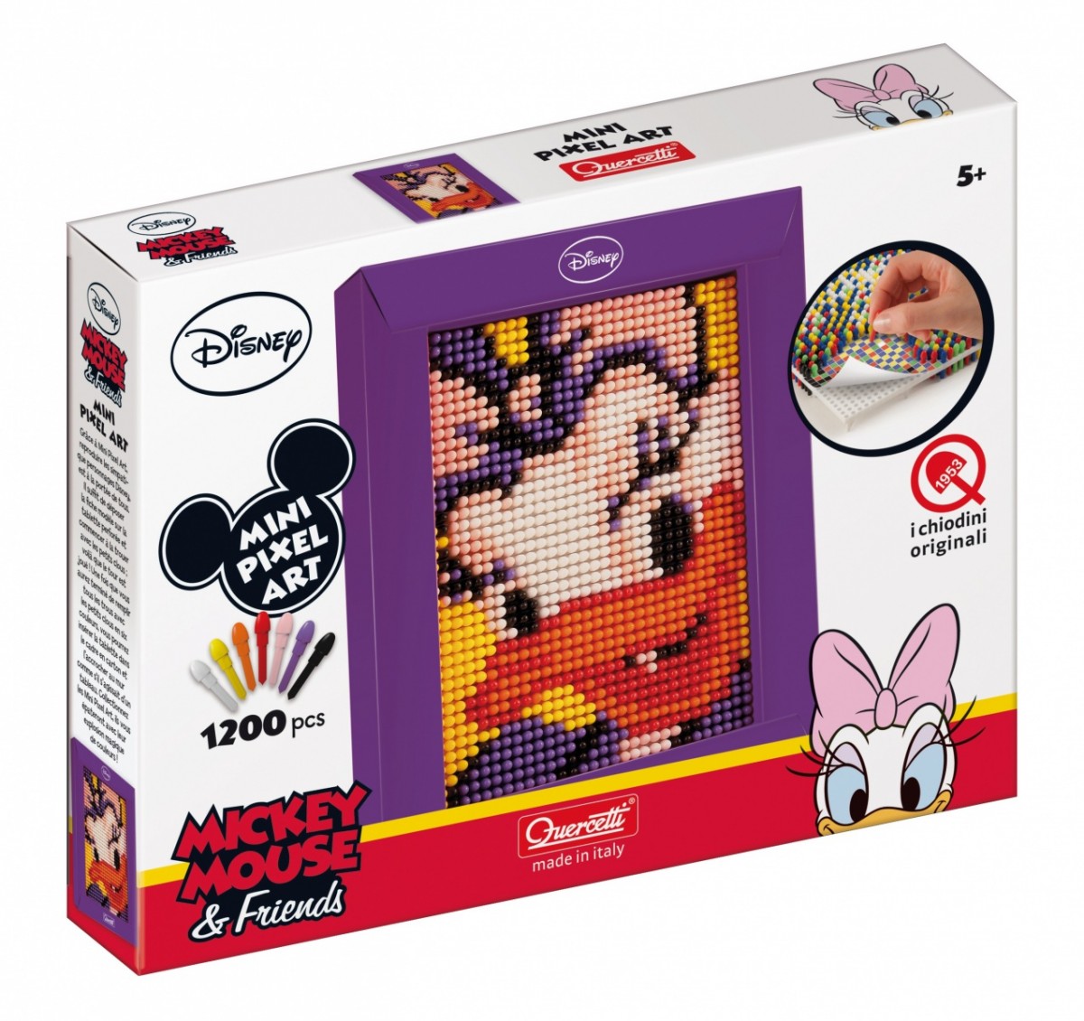 Zestaw składa się z perforowanej tabliczki, 1200 kolorowych kołeczków, kartonowej, elegancjkiej ramki oraz szablonu z Daisy, który pokazuje gdzie należy wbijać kołeczki. Wszystkie elementy wykonane są z tworzywa wysokiej jakości, są elastyczne i zmywalne, nietłukące i bezpieczne.