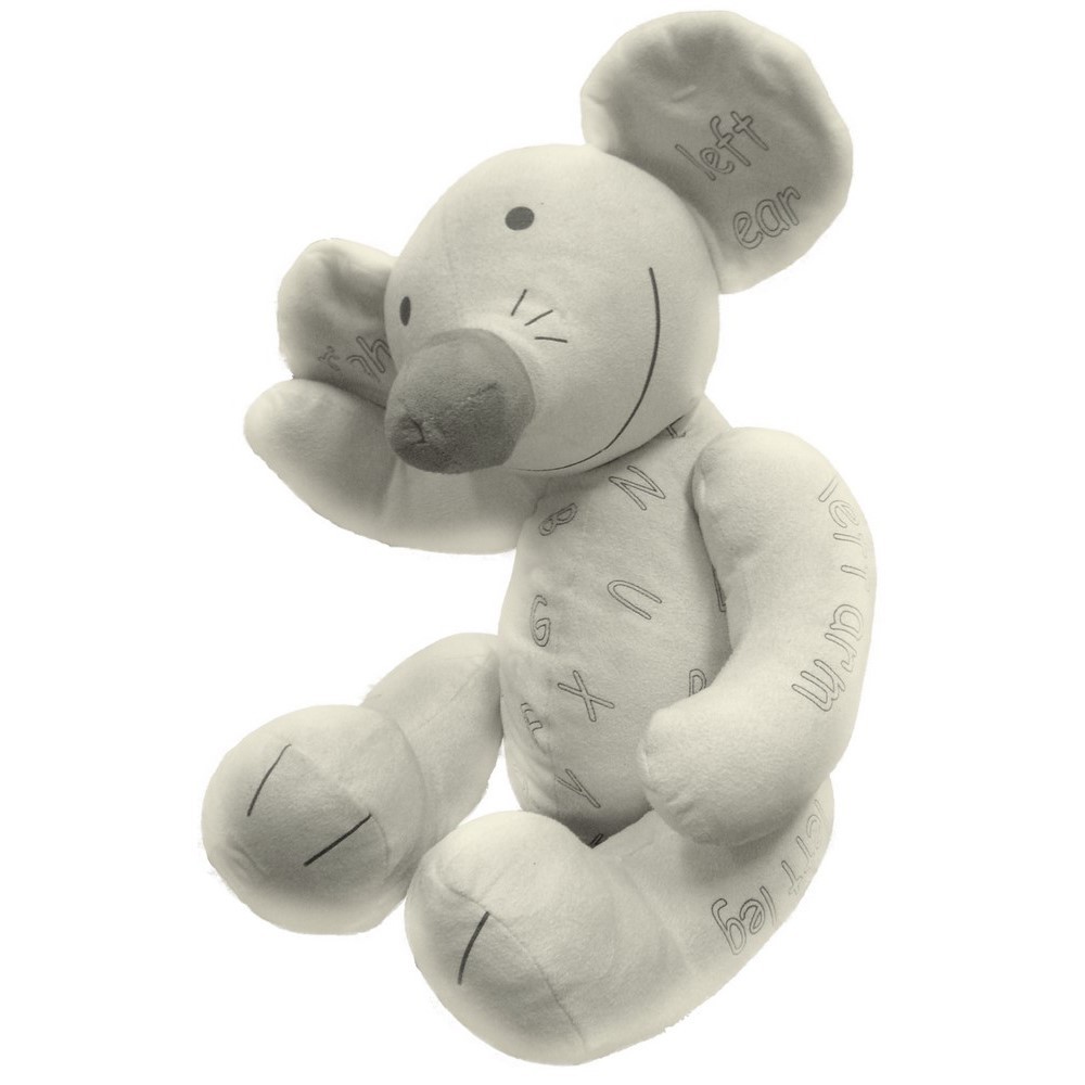 Zabawka edukacyjna przeznaczona także dla najmłodszych. Biała, pluszowa myszka opisana literkami oraz angielskimi nazwami poszczególnych części. Dodatkowo posiada ruchome ramiona oraz nóżki.