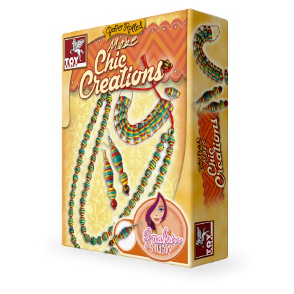 Zestaw do samodzielnego wykonania biżuterii. Zawiera instrukcję i materiały potrzebne do stworzenia kolorowych, papierowych koralików, a następnie skomponowania z nich naszyjnika, kolczyków i bransoletki.