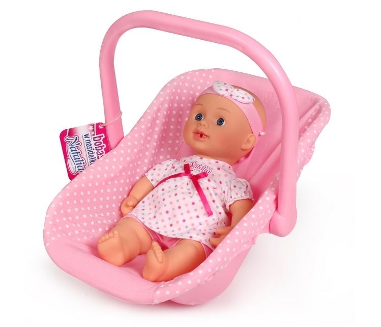 Ma śliczne ubranko i można ją zabrać ze sobą do samochodu lub na spacerek w specjalnym nosidełku.