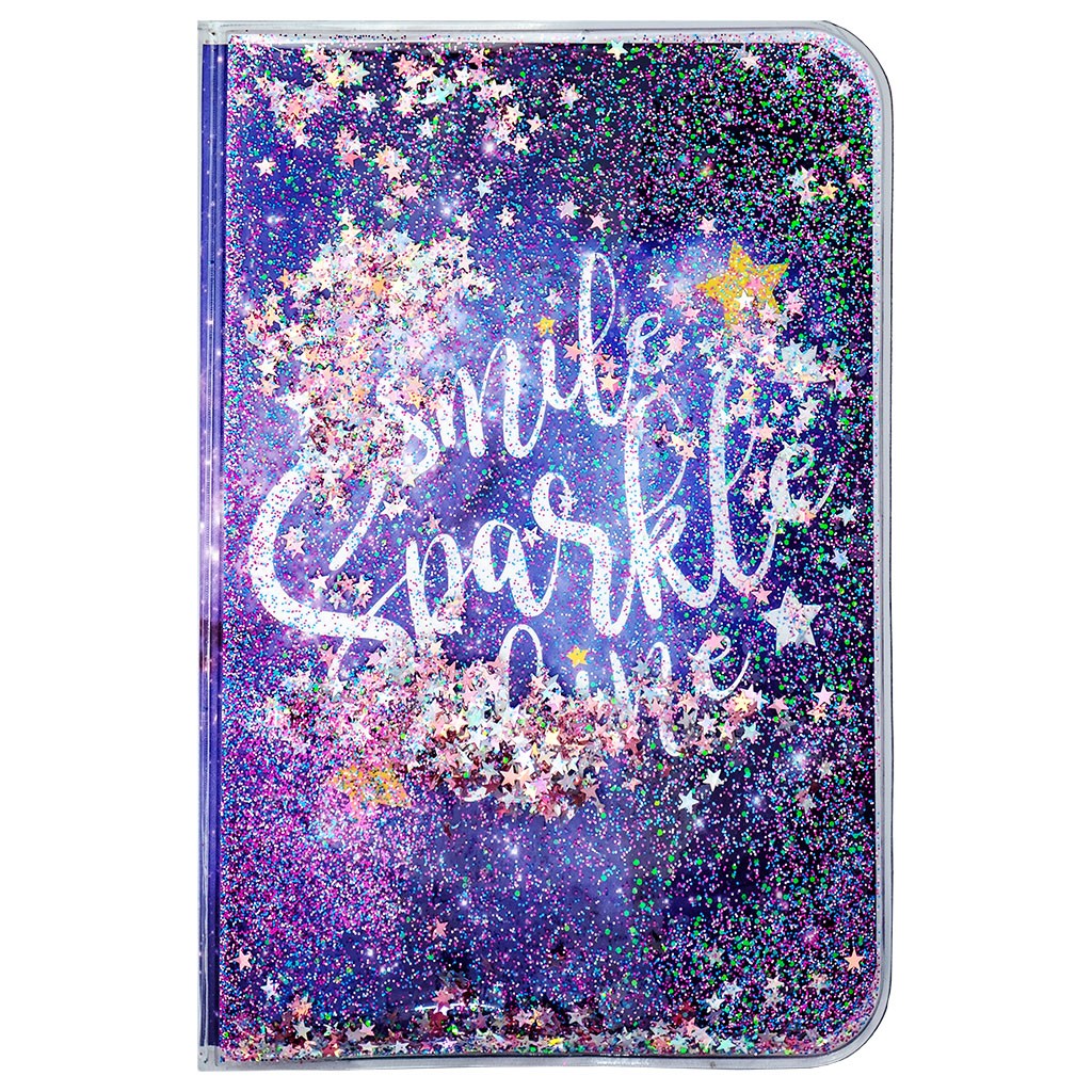 Notatnik z nadrukiem "Smile Sparkle Shine"! Okładka wypełniona jest wodą z gwiazdkami i brokatem. Potrząśnij notatnikiem, aby poruszyć gwiazdki. Kartki notatnika są w cienką kratkę, przyozdobione po bokach fioletowo-niebieskimi gwiazdkami. Notatnik A5, 80 kartek z ozdobnym nadrukiem.