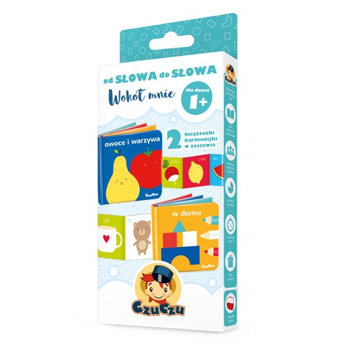 Wokół mnie to zestaw 2 tekturowych książeczek W domu i Owoce i warzywa przedstawiających bliskie maluchom tematy.