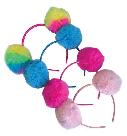 Opaska na włosy obleczona materiałem, z przyczepionymi dwoma włochatymi pomponami. Cztery wersje kolorystyczne: błękitna, jasno różowa, różowa, tęczowa.