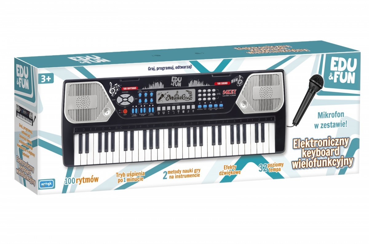 Syntezator z mikrofonem i 54 klawiszami funkcyjnymi.