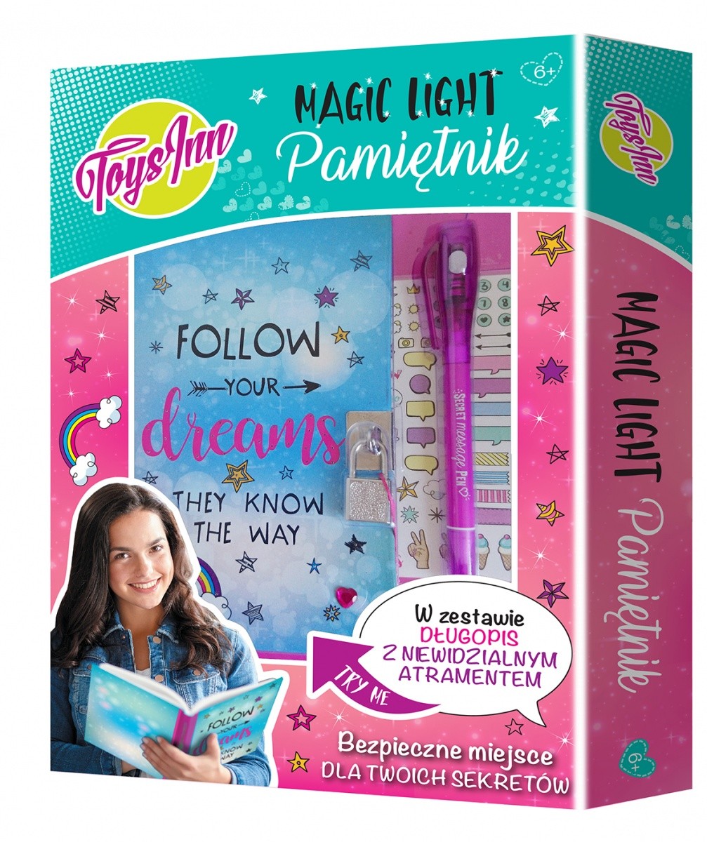 Zestaw zawiera pamiętnik 40 kartkowy, zamykany na kłódkę, ozdobiony świecącymi lampkami LED; 2 arkusze ozdobnych naklejek oraz długopis 2 w 1 z niewidzialnym atramentem.
