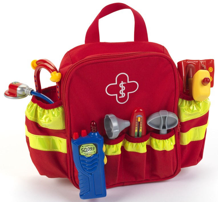 Rewelacyjny plecak ratownika medycznego zawiera podstawowe, niezbędne wyposażenie każdego niosącego pomoc medyka. Czerwony plecaczek z mnóstwem kieszonek na akcesoria wykonany jest z wysokiej jakości tkanin. Komora główna plecaczka wzmocniona jest piankowym wypełnieniem, a dodatkowo na podszewce nadrukowany jest wzorek pasujący do tematyki zabawki. Paskowe szelki mają oczywiście regulowaną długość. Plecaczek posiada także uchwyt do przenoszenia. Ważnym elementem są bardzo wyraźne paski odblaskowe naszyte na wszystkich zewnętrznych kieszeniach.