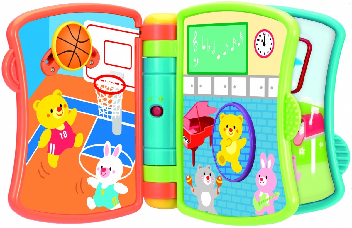 Każda strona książeczki przedstawia inną historię, a dzięki interakcji (ruchome elementy - można wciskać, przekręcać oraz przesuwać) wpływa na rozwój dziecka i jego zmysły poznawcze. Dodatkowo podczas przewracania stron książeczka wygrywa radosne dźwięki i melodie. Zabawka posiada także trzy kolorowe uchwyty o różnej fakturze, co uwrażliwi zmysł dotyku dziecka.