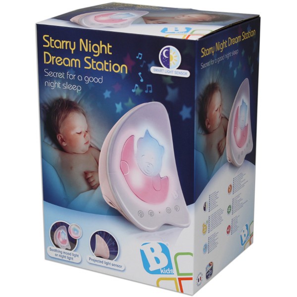 Projektor Gwieździsta Noc to unikatowa lampka nocna ze specjalną funkcją trenującą sen. Urządzenie wpływa pozytywnie na zdrowie dziecka poprzez uspokajanie i usypianie dziecka, utrzymywanie spokojnego snu i delikatne wybudzanie. Projektor gra kojące melodie oraz wyświetla gwieździsty display świetlny w pokoju.