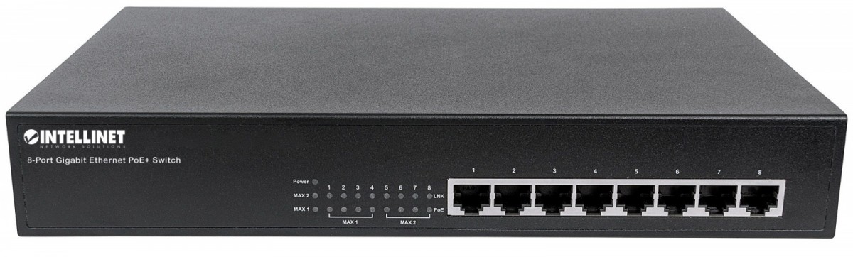 8-portowy przełącznik Gigabit Ethernet PoE + firmy Intellinet Network Solutions jest przeznaczony do przesyłania zarówno danych, jak i energii elektrycznej do szeregu urządzeń zgodnych z PoE za pomocą standardowych kabli sieciowych Cat5e lub Cat6. Przełącznik wyposażony w osiem portów Gigabit Ethernet może zasilać punkty i mosty dostępu do bezprzewodowej sieci LAN, telefony VoIP, kamery wideo IP i inne, zapewniając prędkość sieci do 1000 Mb / s.