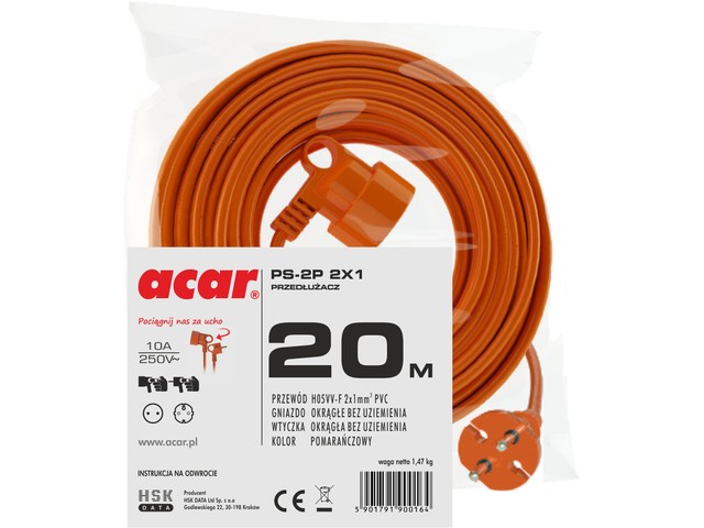 Strona główna Akcesoria RTV listwy zasilające Przedłużacz PS-2P 2x1 20m bez styku ochronnego pomarańczowy H05VVVDE Cena Netto: 29,26 zł. error_outline Produkt chwilowo niedostępny. Opis Przedłużacz ogrodowy ACAR PS-2P w kolorze pomarańczowym, bez uziemienia.