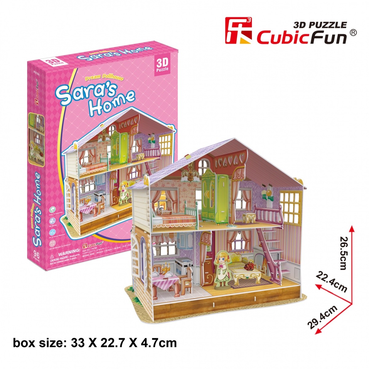 Opakowanie zawiera puzzle 3D, które umożliwiają złożenie domku dla lalek Sara's Home.