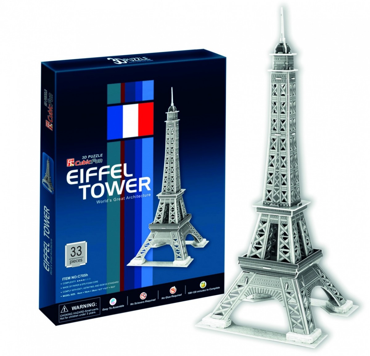 Wieża Eiffel'a Cubic Fun, to puzzle 3D do samodzielnego składania. Pasjonująca zabawa dla kolekcjonerów najsłynniejszych budowli świata. Do tworzenia nie potrzeba żadnych przyborów, wystarczy wyjąć z arkusza kawałki piankowych puzzli i rozpocząć budowę. Seria zawiera w sobie najpiękniejsze i najsłynniejsze architektoniczne budowle i monumenty. Zabawka rozwija wyobraźnię przestrzenną oraz zdolności manualne u dzieci.