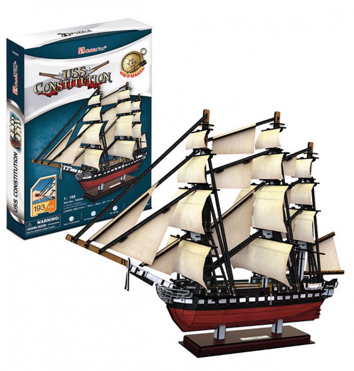 Opakowanie zawiera puzzle 3D, które umożliwiają złożenie modelu Żaglowiec USS Constitution.