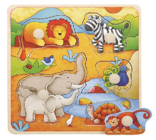 Drewniana układanka z drewnianymi pinezkami z motywem zwierząt mieszkających w Afryce firmy Top Bright. Układanka zawiera 5 elementów.