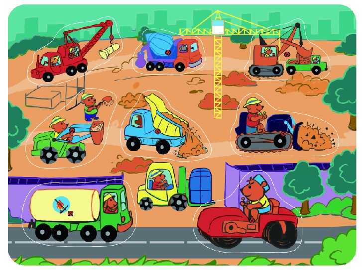 Drewniana układanka z pinezkami z motywem maszyn budowlanych firmy Top Bright. Układanka zawiera 8 elementów.
