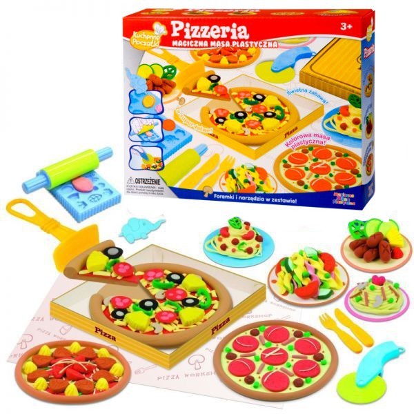 W zestawie znajdują się 4 masy w 3 podstawowych kolorach: żółtym, niebieskim i czerwonym oraz białym, wałeczek i rozmaite, stosowne dla właściwej kuchni foremki do kształtowania mas, a także inne akcesoria przydatne do zabawy określonym zestawem, takie jak talerz, sztućce, łopatka i nożyk do pizzy. Dodatkowo na pudełku znajdziesz różne talerze do wycięcia oraz rady jak mieszać kolory by powstały nowe, takie jak zielony, pomarańczowy czy fioletowy.
