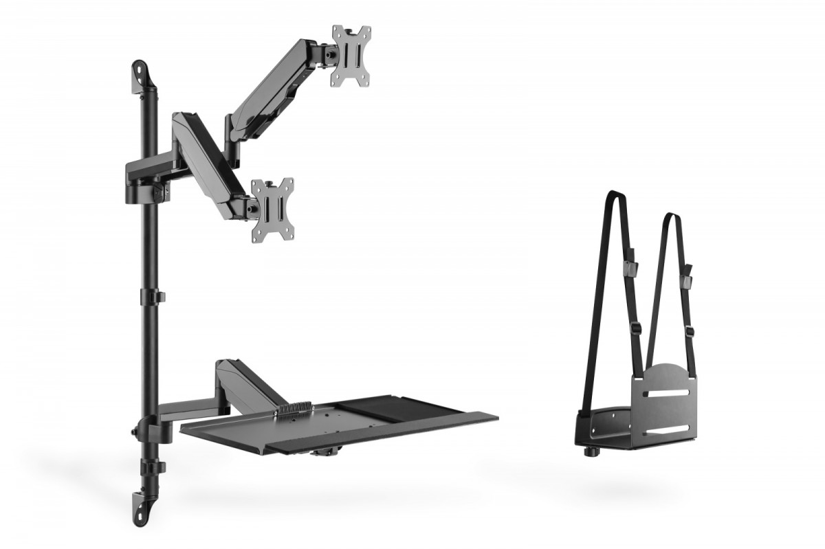 Uniwersalny uchwyt ścienny do montażu dwóch monitorów, klawiatury/myszy i komputera PC z elastyczną regulacją wysokości roboczej. Przygotuj stanowisko pracy, które może być dopasowane pod kątem wysokości roboczej dla wielu osób mimo różnicy we wzroście, dzięki trzem szybkim krokom. Dwie wbudowane sprężyny gazowe wspomagają cię w dziecinnie prostej regulacji wysokości monitorów. Półka na klawiaturę może być również łatwo regulowana za pomocą ramienia ze sprężyną gazową. W zestawie znajduje się uchwyt na komputer PC do montażu na ścianie.