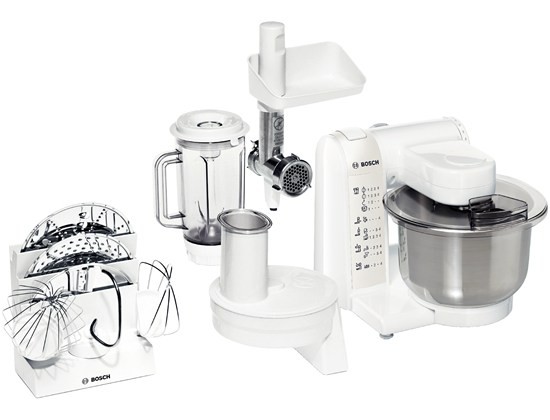 ProfiMixx electronic, Robot kuchenny, 600 W, multi-motion-drive: innowacyjny, wielokierunkowy ruch planetarny zabieraków, 4-stopniowa regulacja prędkości, funkcja pracy pulsacyjnej, wielofunkcyjne ramię ze specjalną przekładnią, maszynka do mielenia mięsa, rozdrabniacz, mikser z tworzywa sztucznego o poj. 0,75l, tarcze ze stali szlachetnej: dwustronna do krojenia na plasterki, dwustronna tnąca na wiórki, tarcza do drobnego tarcia, misa ze stali szlachetnej z przykrywką (poj. max. 2,7 kg), końcówki: do mieszania ciasta, ubijania piany, hak do zagniatania ciasta, pojemnik do przechowywania końcówek i tarcz, interaktywna płyta DVD z przepisami kulinarnymi, zintegrowany schowek na kabel, kolor: biały