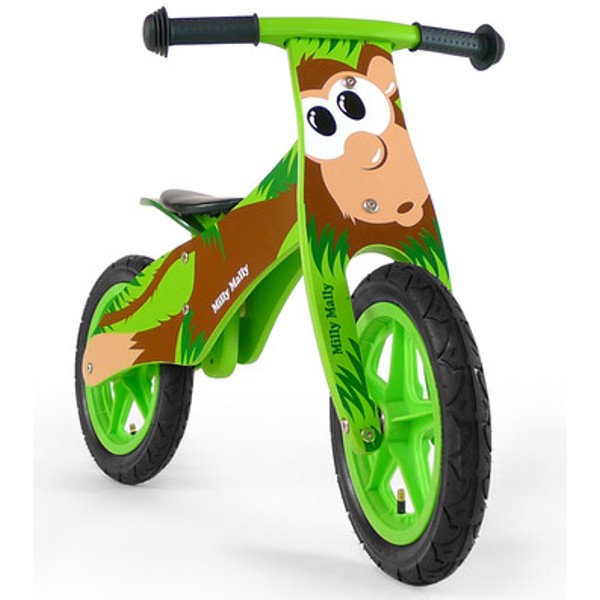 Rowerek Biegowy Duplo Małpka charakteryzuje się nowoczesnym wyglądem, posiada antypoślizgowe rączki, solidną ramę wykonaną z lekkiego drewna, łożyskowane koła z obręczami, opony rowerowe z bieżnikiem i wentylem oraz miękkie i wygodne siedzisko, którego wysokość można regulować.