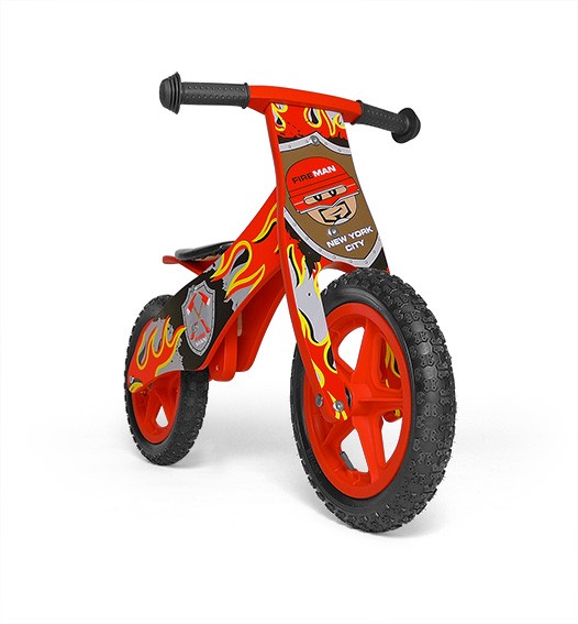 Rowerek Biegowy Duplo Straż Pożarna charakteryzuje się nowoczesnym wyglądem, posiada antypoślizgowe rączki, solidną ramę wykonaną z lekkiego drewna, łożyskowane koła z obręczami, opony rowerowe z bieżnikiem i wentylem oraz miękkie i wygodne siedzisko, którego wysokość można regulować.