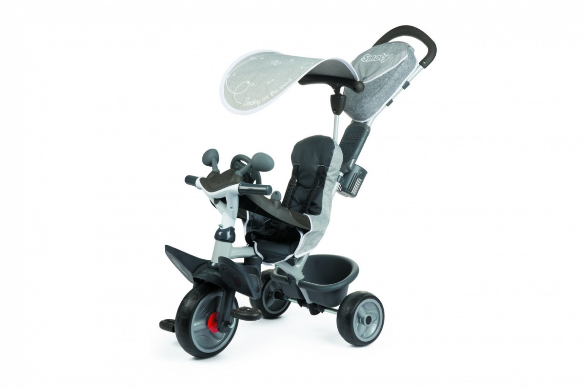 Rowerek z regulowaną rączką, blokadą kierownicy, pasami i pierścieniem bezpieczeństwa, komfortowym i ergonomicznym siedziskiem z zagłówkiem, blokadą wolnego koła, pojemnikiem na drobiazgi i torbą oraz daszkiem przeciwsłonecznym.