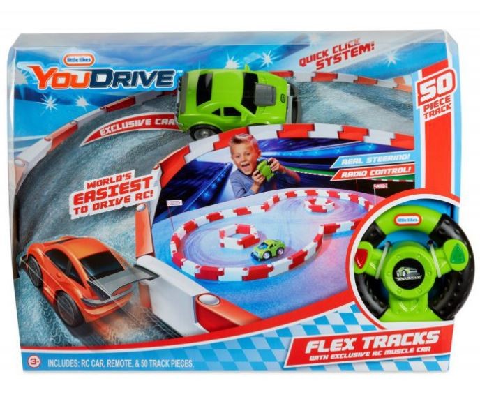 - W zestawie: Zdalnie sterowany, ekskluzywny zielony samochód RC Muscle Pilot w kształcie kierownicy - posiada 2 przyciski (start i stop) 50 elementów systemu toru Flex Tracks