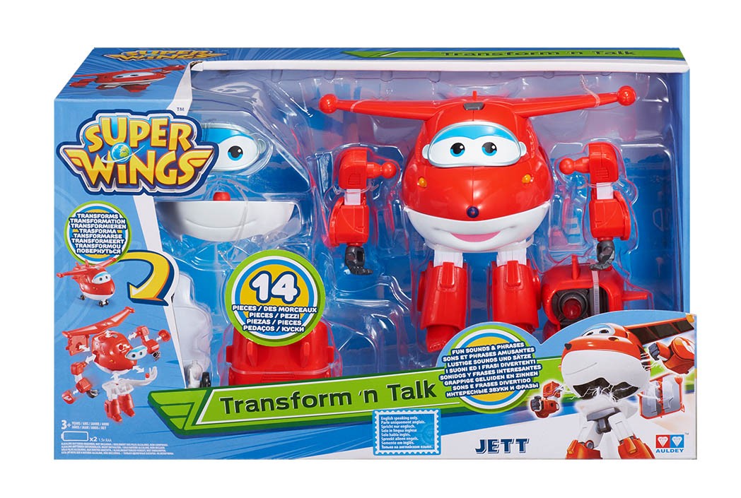 Jett spieszy z się z dostarczeniem zabawek dla dzieci. Nie ma chwili do stracenia, dzieci czekają! Ten mały czerwony samolocik potrafi przeobrazić się w prawdziwego robota, a do tego wystarczy tylko 14 części. Zabawka ma różne warianty ust, uruchamiają efekty dźwiękowe.